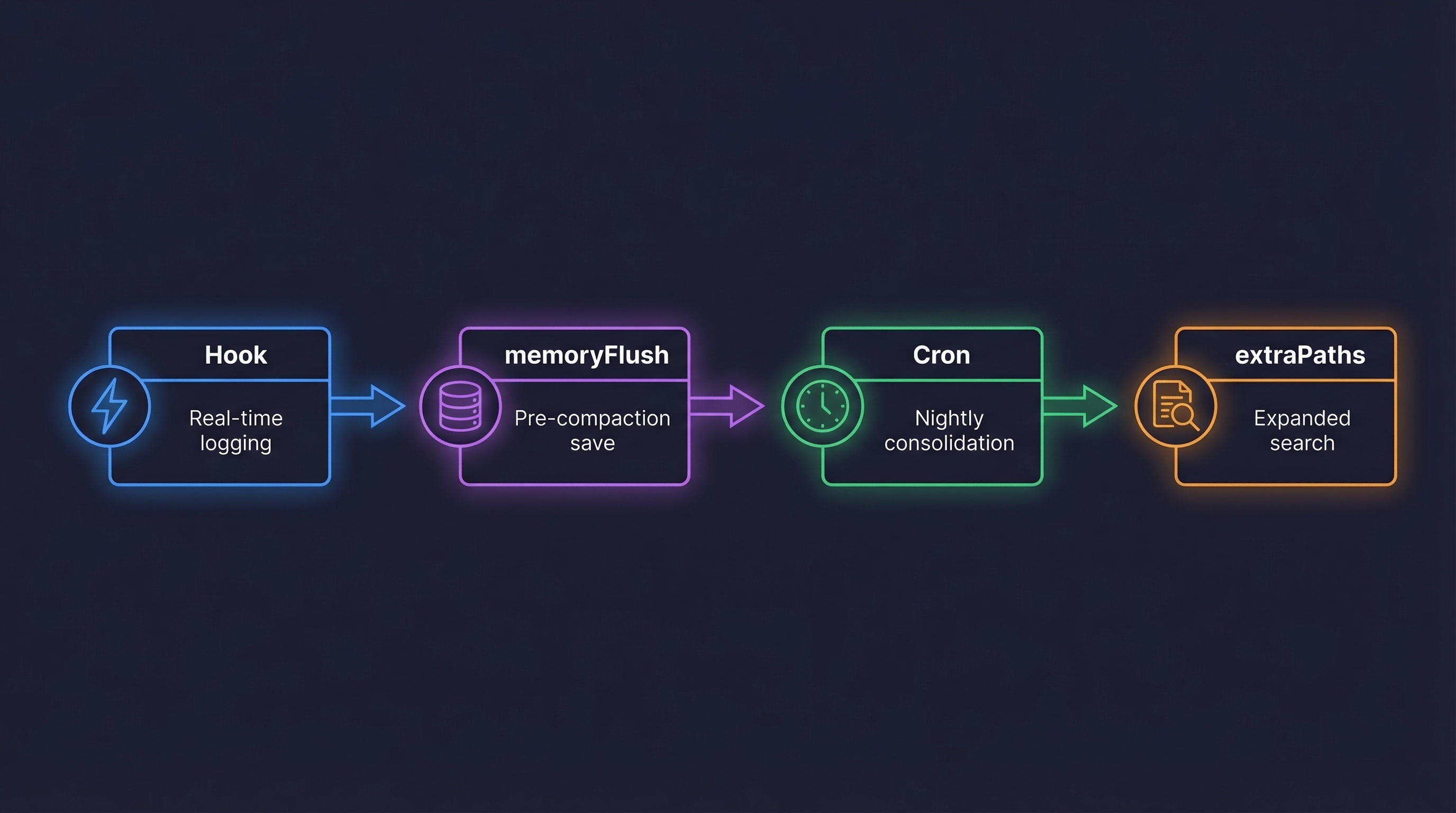 I configured memorySearch.extraPaths to index my entire notes vault. Now when the agent does a memory search, it searches across daily notes, project docs, people notes, and system documentation — not just the default memory folder.